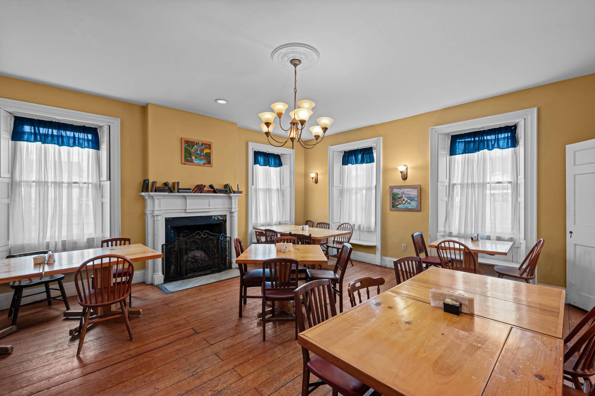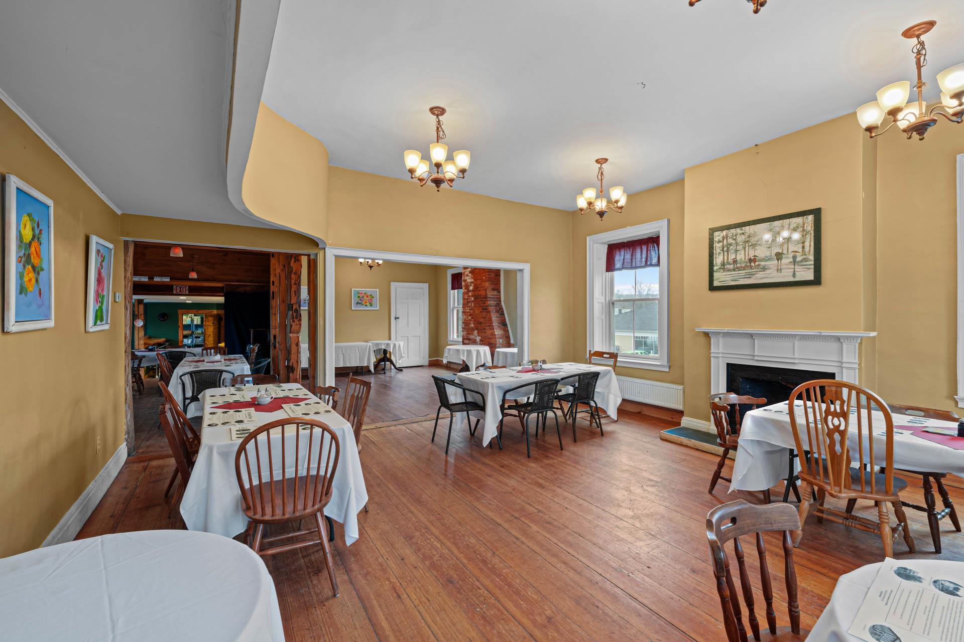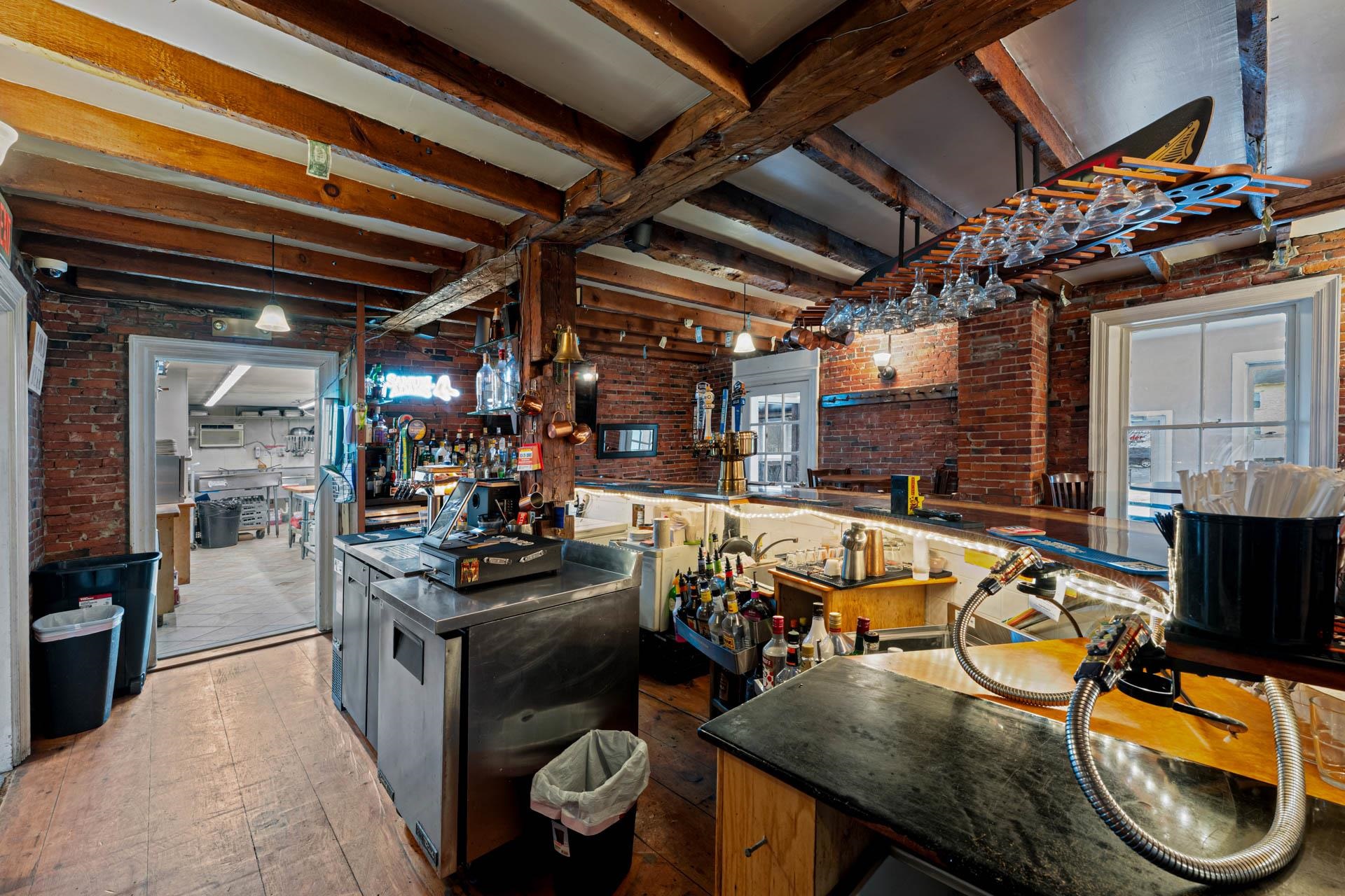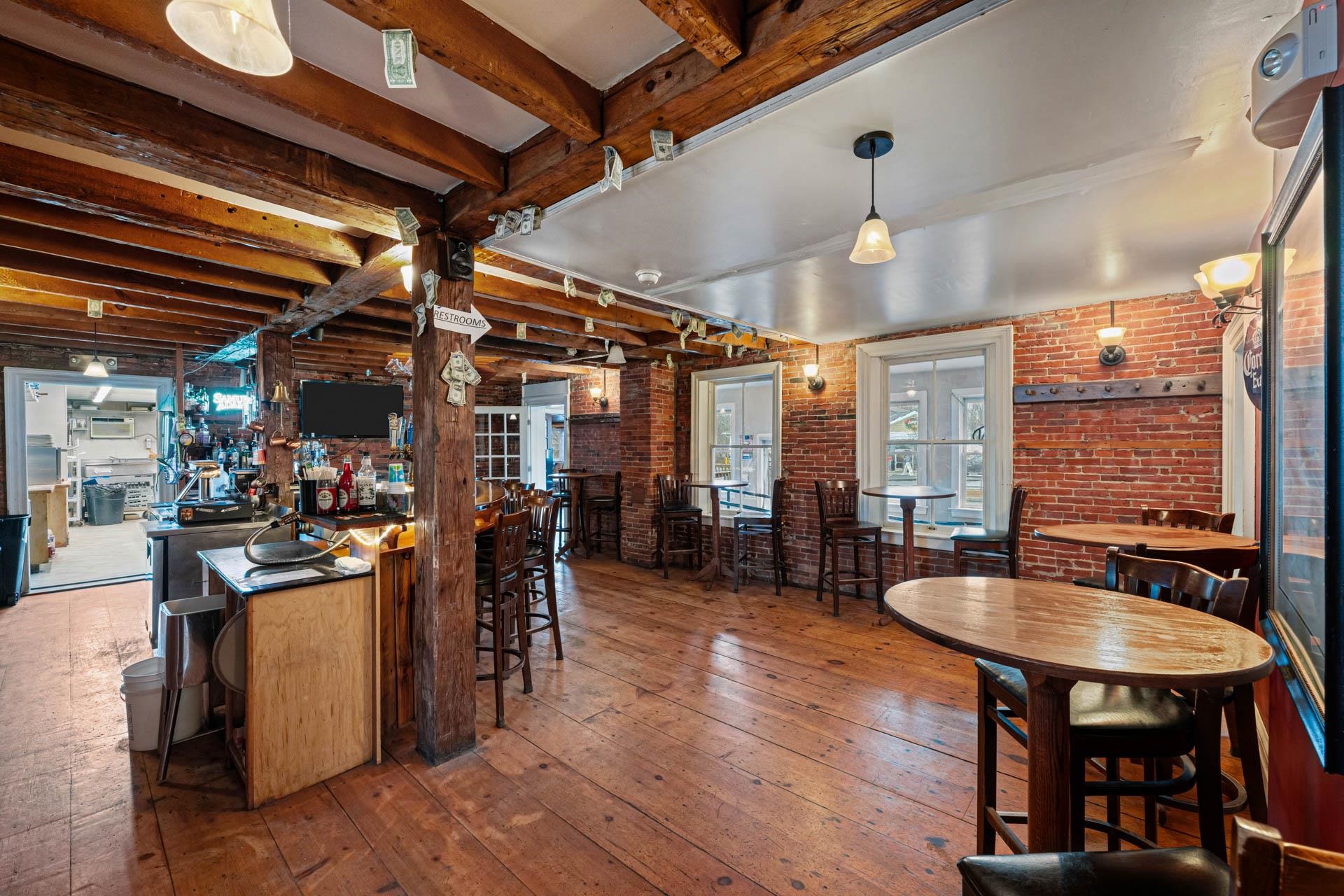 Exceptional opportunity to own a landmark mixed-use property in the heart of Charlestown's historic town center. Originally built in 1834, this beautifully restored property blends timeless character with modern upgrades, featuring a fully operational restaurant, event space, and additional income-producing units. The main building is home to a well-established restaurant and bar with seating for 70+ guests, plus seasonal outdoor deck seating. Rich in historic charm, the space showcases original curved walls, preserved mantels, crown molding, ceiling medallions, and a striking eastern winding staircase, complemented by exposed post-and-beam elements and warm wood flooring. The main level includes three public restrooms, while the upper level offers a private event space with its own bar (upgraded in 2020) and dining area. Additional storage is available in the full basement and walk-up attic. Major system upgrades include a 50-year asphalt roof (2011), 9-zone radiant heat with supplemental wall heaters (2011), upgraded 225-amp electrical service (2011), refinished floors (2011), a Bosch Buderus furnace, and a tankless hot water system (2023). The property also benefits from professionally installed spray-foam insulation in the walls and attic, significantly improving energy efficiency and reducing heating costs. The detached outbuilding, renovated in 2022, features a modern oversized studio apartment currently rented at $1,100/month with a stackable washer/dryer, along with a lower-level office/commercial/storage space, offering added flexibility and income potential. With a prime Main Street location and excellent visibility, this property offers a rare opportunity for investors or owner-operators looking for an exceptional asset with multiple revenue streams.